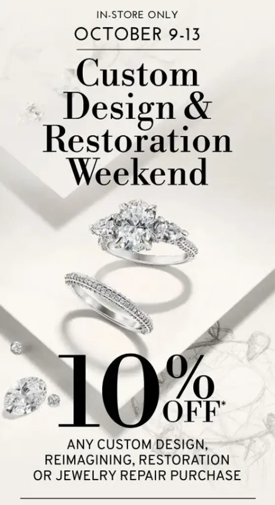 *Offer only available at Jared Jewelers. Cannot be combined with any other offers or discounts. Only available during the Custom Design & Restoration Weekend when payment is made in full. Custom Design discount cannot be redeemed on loose diamonds and gemstones, previously owned jewelry, protection plans or purchases made with trade-ins. Any fine jewelry qualifies for this offer – we work on gold, platinum, and sterling silver jewelry. Applicable on in-store care, repair or custom design services only. See Jewelry Expert for details. Valid through 10/13/2025.