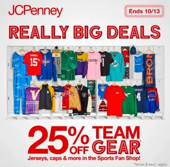 Disclaimer: 25% off select men’s, women’s, and children’s team sports products. Limited time special, while supplies last. Some exclusions apply. See store associate or jcp.com for details.