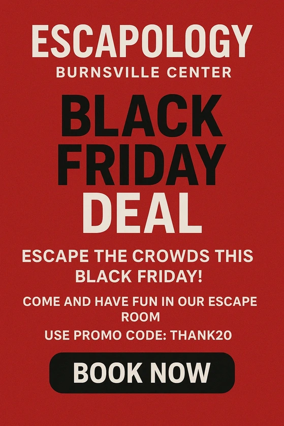 Come to Escapology at Burnsville Center for a day of discounted Escape Room fun. Skip the long lines and busy stores and enjoy an exciting adventure with friends and family!