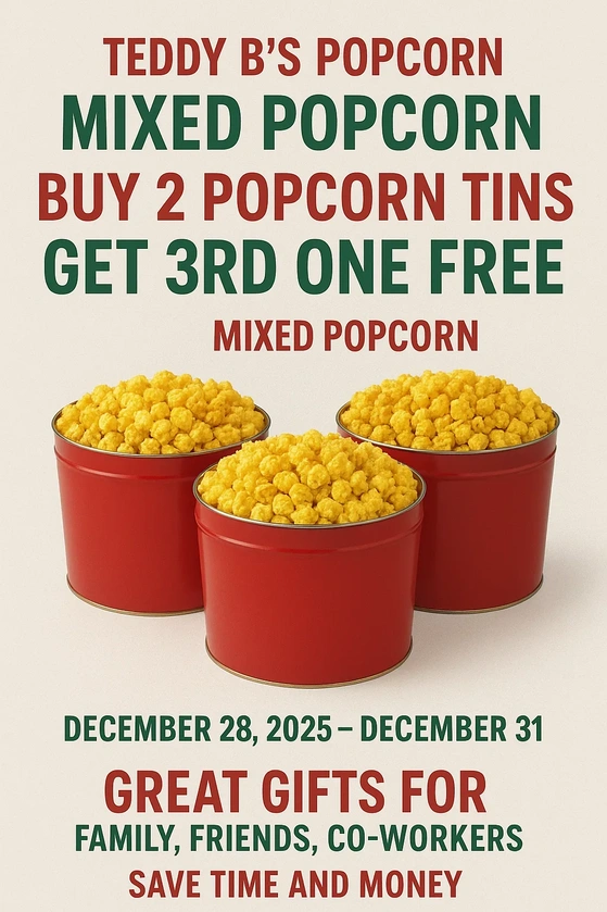 The Holiday Special is on the Mixed Flavor Popcorn Tins—perfect for gifting or sharing. Teddy B’s offers a wide variety of delicious flavors, and once you smell that amazing popcorn aroma, you’ll want to try them all!